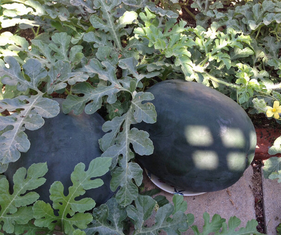 An excellent late-season variety for home and market growers. The dark blue-green rind is tough and briuse resistant. Large leaves prevent sunburn on the melons. The flesh is bright red with great flavor, sweet and firm. They average 35 to 50 pounds, but can get up to 74 pounds. Ready in about 90 days.