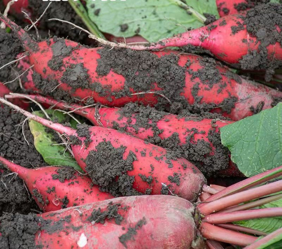 How to Grow China Rose Radish grows best in soil with a PH of 5.8-6.8. Although their roots can loosen compacted soil, they grow best where soil is already loose. If your soil is compacted, consider loosening it with a broad fork before planting. Since you will be harvesting the roots, avoid applying excessive amounts of nitrogen to the soil. Too much nitrogen will grow large greens, but small roots. Choose a full sun to partial shade location for best results. Once you plant your seeds, make sure you keep the soil moist, and they will germinate within a few days. Within a week of germination, thin seedlings to 4-6 inches apart. Plants will mature in 40-70 days, depending on the variety. Don’t fret if part of the root is visible above ground; this is normal.
